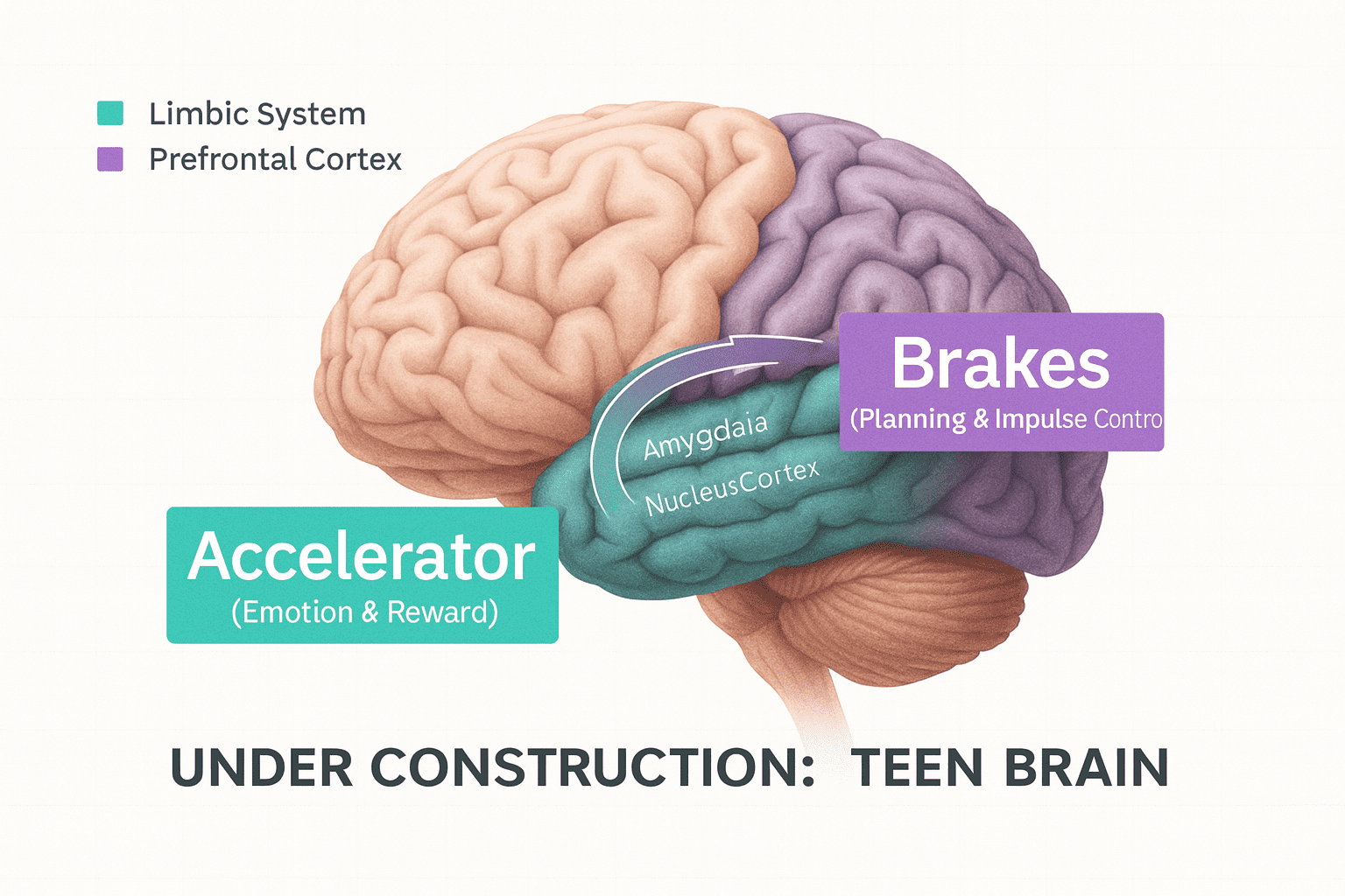 “An accelerator with developing brakes.” The limbic system (emotion/reward) upgrades before the prefrontal cortex (planning/impulse control). Translation: big feelings and novelty-seeking are normal while the “brakes” are still wiring up. Guidance at this stage isn’t micromanagement—it’s installing guardrails on a mountain road.